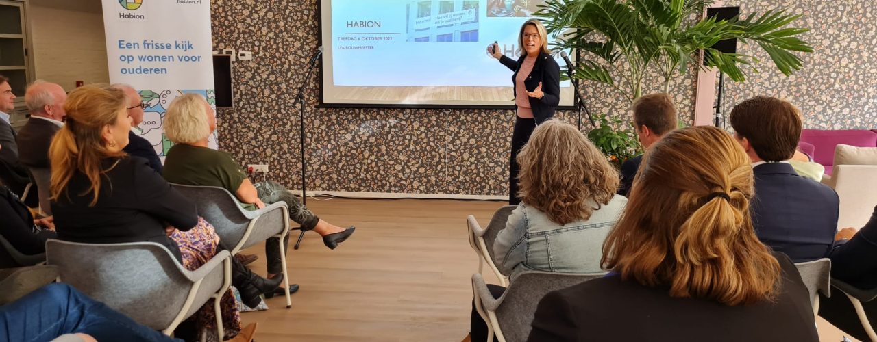 Lea Bouwmeester, betrokken bij diverse vernieuwingen in de zorg en oud Tweede Kamerlid, was spreker tijdens de jaarlijkse Trefdag van Habion, die op 6 oktober 2022 plaats vond. De trefdag is de bijeenkomst van belanghouders van Habion. De oproep van Lea Bouwmeester om collectieve slimheid te organiseren paste goed bij het diverse pluimage van de deelnemers aan de bijeenkomst: bewoners, gemeenten, zorgorganisaties, onderhoudspartijen en diverse mensen met andere achtergronden waren aanwezig. De deelnemers brachten de collectieve slimheid direct in de praktijk, door in kleinere groepjes van gedachte te wisselen over het thema ‘Van eigen huis naar samen wonen’. Dit thema is één van de vijf transformaties die volgens het programma ouderworden2040 nodig zijn om de komende jaren in te spelen op de kansen en uitdagingen van onze vergrijzende samenleving. De bijeenkomst vond plaats op de locatie De Vier Dorpen in Beekbergen. Daar transformeerden we een verpleeghuis tot een gebouw met 51 zelfstandige appartementen. Voor meer informatie daarover klik hier.