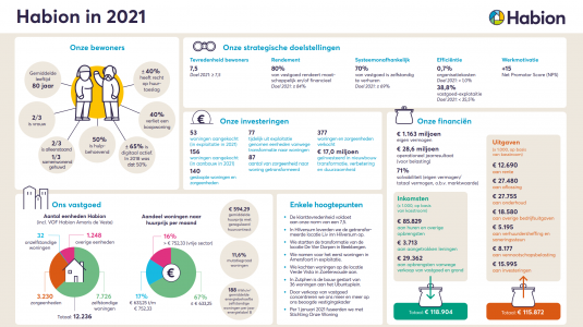 Stijgende energieprijzen, toenemende inflatie en een bouwcrisis, of misschien wel een regelcrisis. Er zijn genoeg zaken die onze aandacht vragen. Daarmee is er vaak weinig tijd om terug te blikken op het jaar dat achter ons ligt. Dat is jammer, omdat wij ook in 2021 ons samen met onze bewoners en andere partners hebben ingezet om (toekomstige) bewoners een veilig en comfortabel thuis te kunnen blijven bieden. In ons Jaarverslag Habion 2021 geven wij inzicht in onze activiteiten in 2021. Voor degenen die geen tijd hebben het volledige verslag door te nemen, hebben wij de kern ervan in een infographic aangegeven.