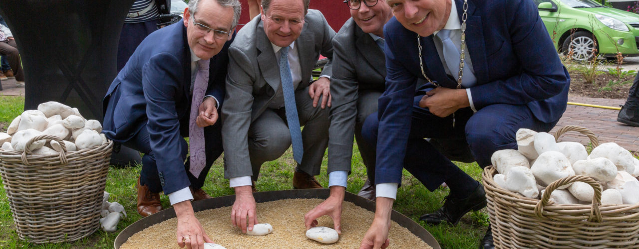 Een hart gevuld met witte natuurstenen markeert de opening van het nieuwe Schoonoord in Baarn. Burgemeester Mark Roëll opende op maandag 27 mei dit prachtige woonzorggebouw aan de Tromplaan. “Als gemeente Baarn zijn wij ontzettend trots op Schoonoord en ik wens iedereen hier een mooie tijd’. Als openingshandeling schreef de burgemeester zijn naam op een steentje en plaatste dat in een groot hart, samen met Ton de Rond (Habion), René Hup (Amaris) en wethouder Erwin Jansma. De bewoners en andere betrokkenen volgden hun voorbeeld. Het hart in de tuin vormt een blijvende herinnering aan de opening.