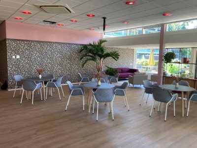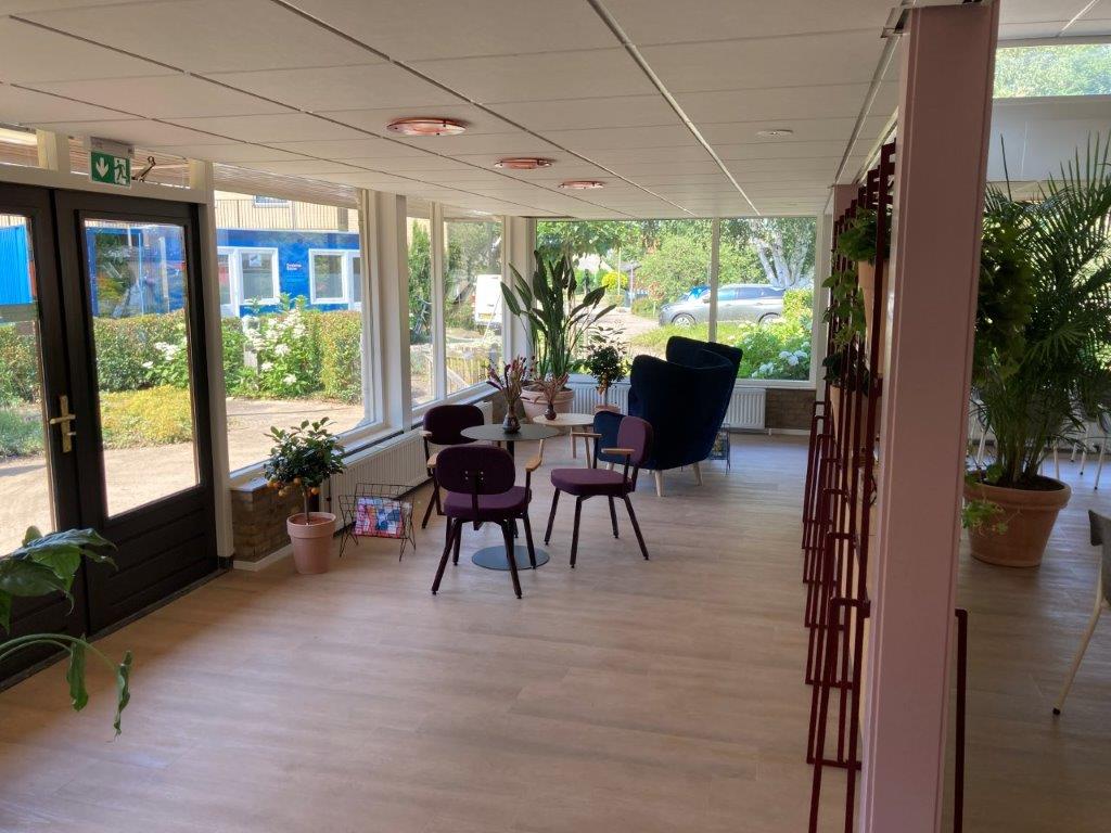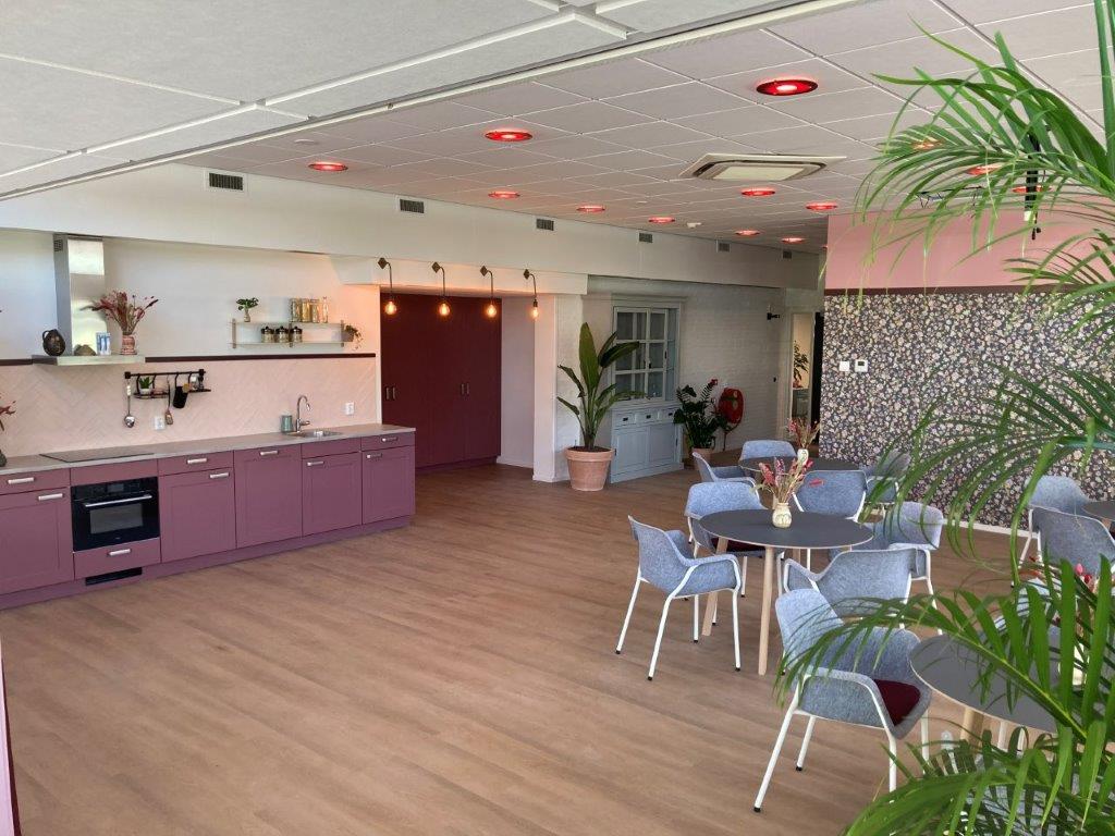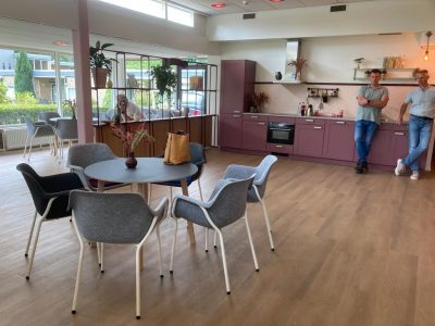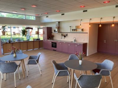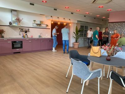 De ontmoetingsruimte is opnieuw ingericht met een bibliotheek, een kookstudio en een ontmoetingsruimte. De bewoners hebben zelf de invulling van de ruimte bepaald.