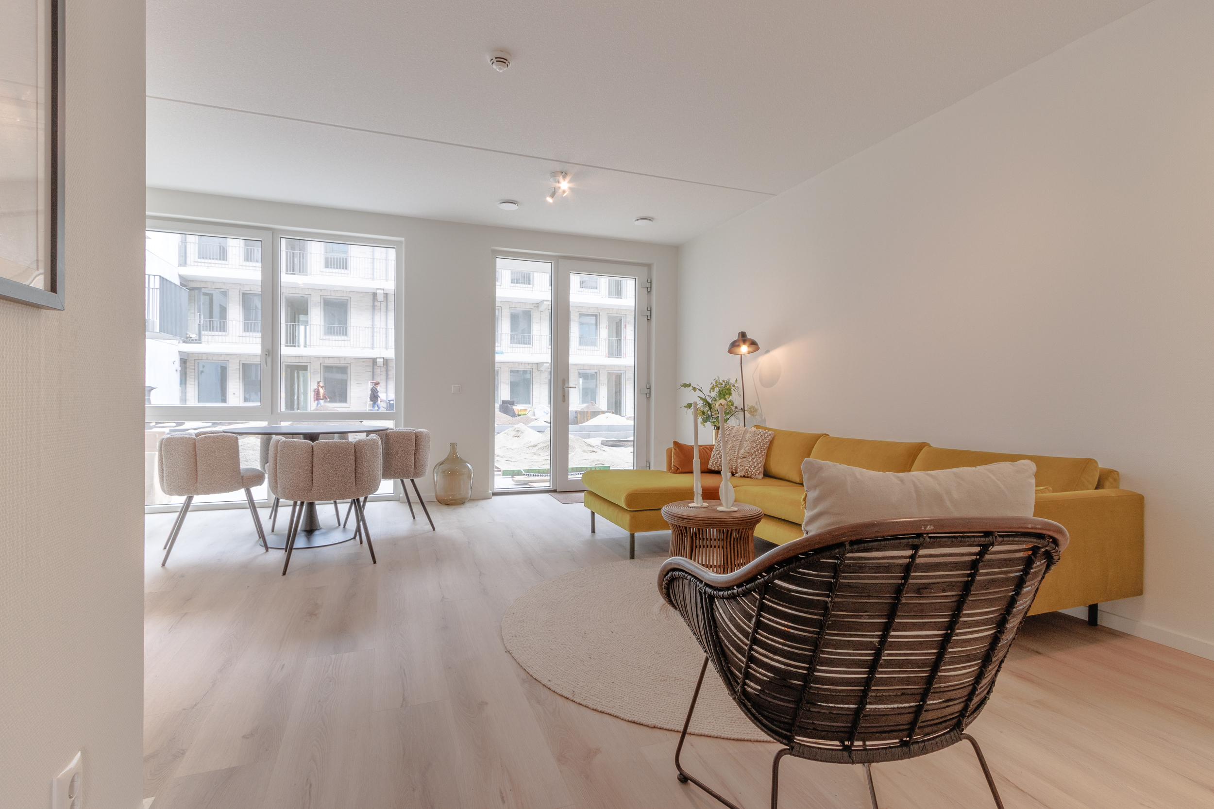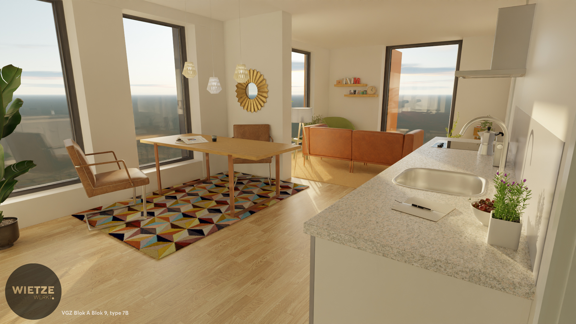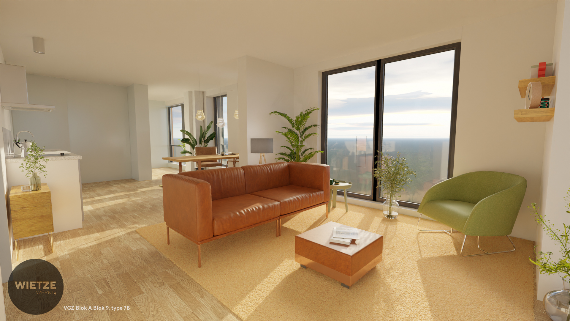 De foto’s van appartementen en gebouwen berusten zoveel mogelijk op de echte afmetingen, maar het blijven impressies: er kunnen geen rechten aan worden ontleend.